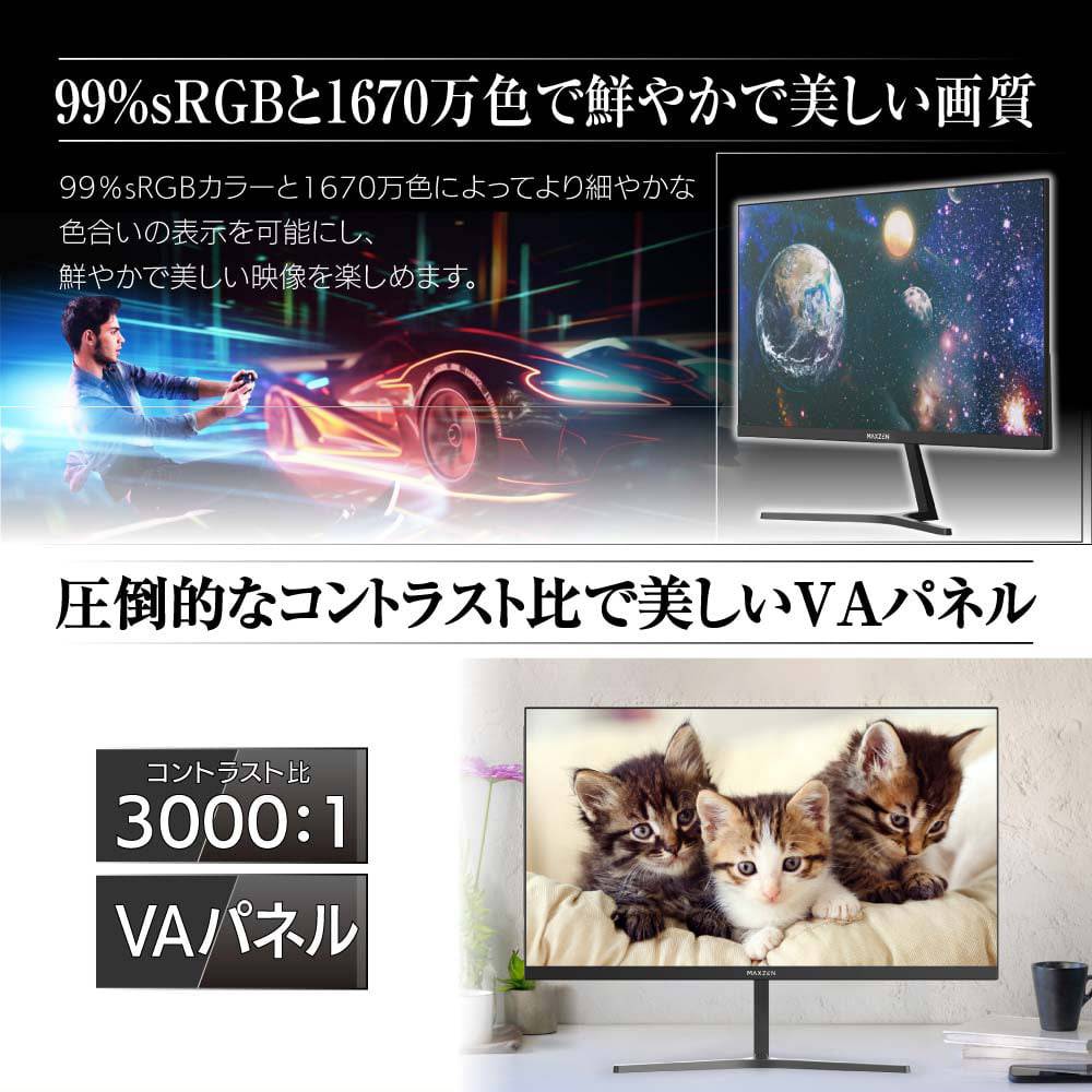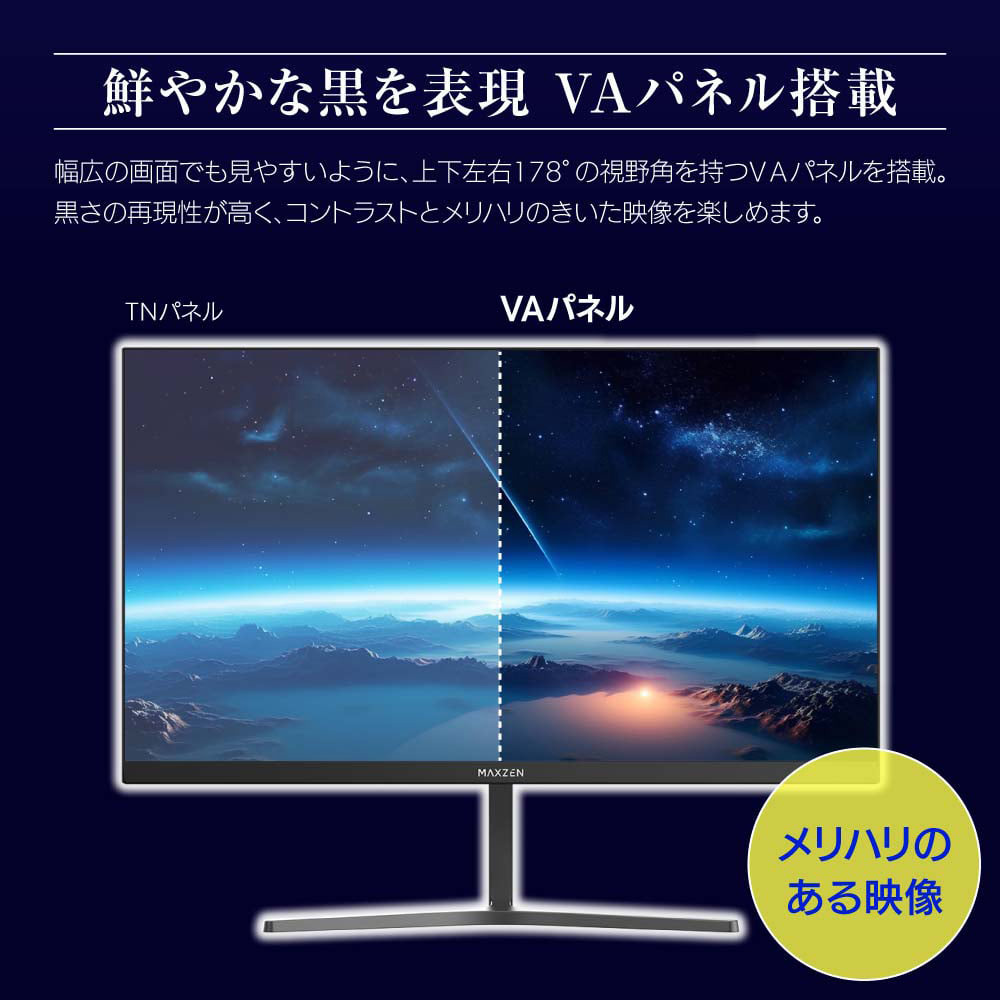 幅広の画面でも見やすいように、上下左右178°の視野角を持つVAパネルを搭載。