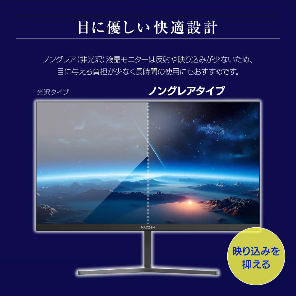 ノングレア(非光沢)液晶モニターは反射や映り込みが少ないため、目に与える負担が少なく長時間の使用にもおすすめです。