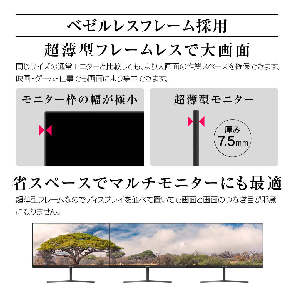 超薄型フレームなのでディスプレイを並べて置いても画面と画面のつなぎ目が邪魔になりません。