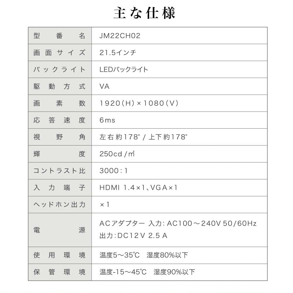* 付属品:スタンド×1セット、スタンド固定ネジ×1本、ACアダプター×1個、取扱説明書×1部、HDMIケーブル1本