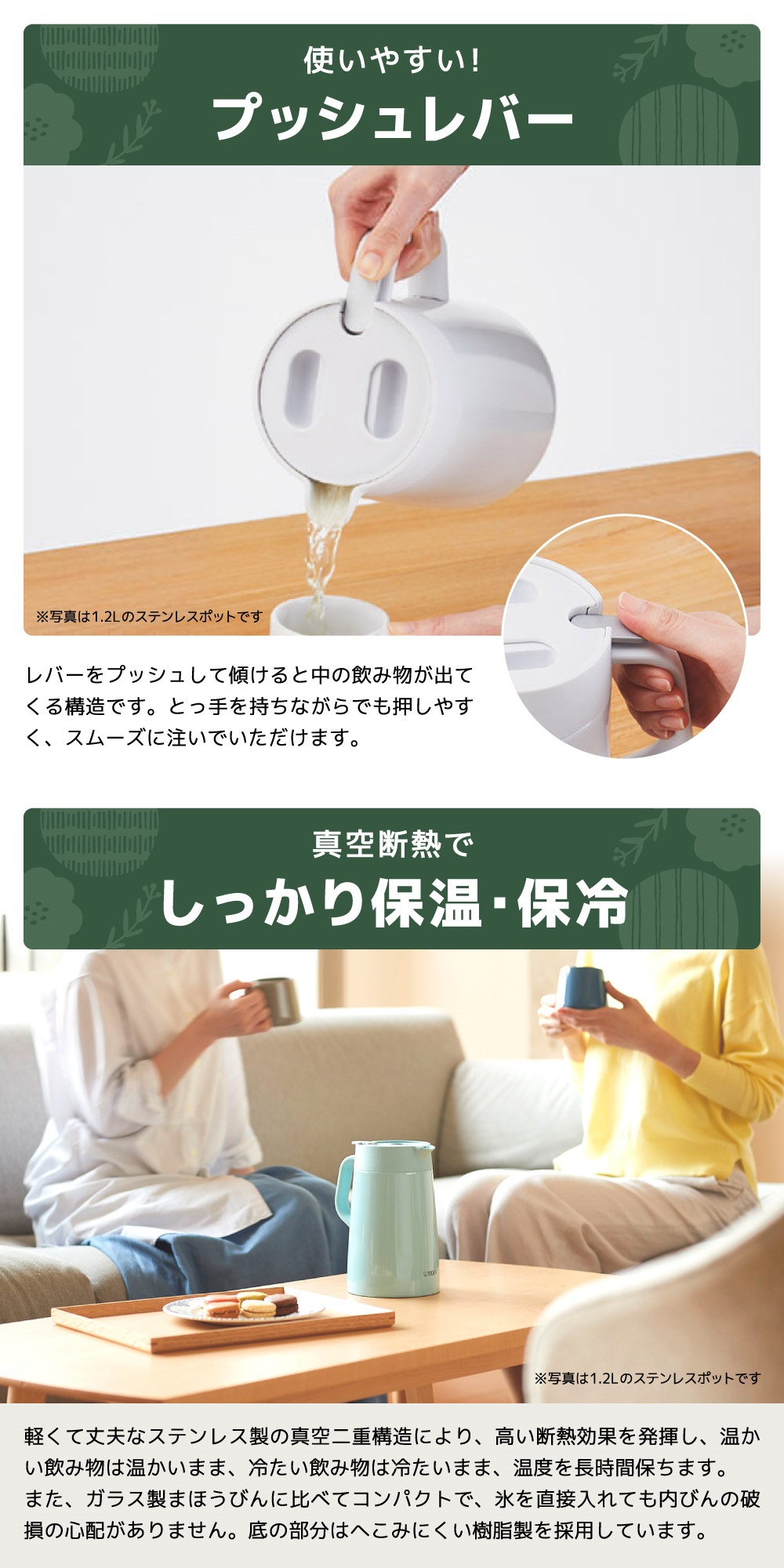 例えば、朝入れたコーヒーやお茶はお昼になっても飲みごろ温度をキープ。