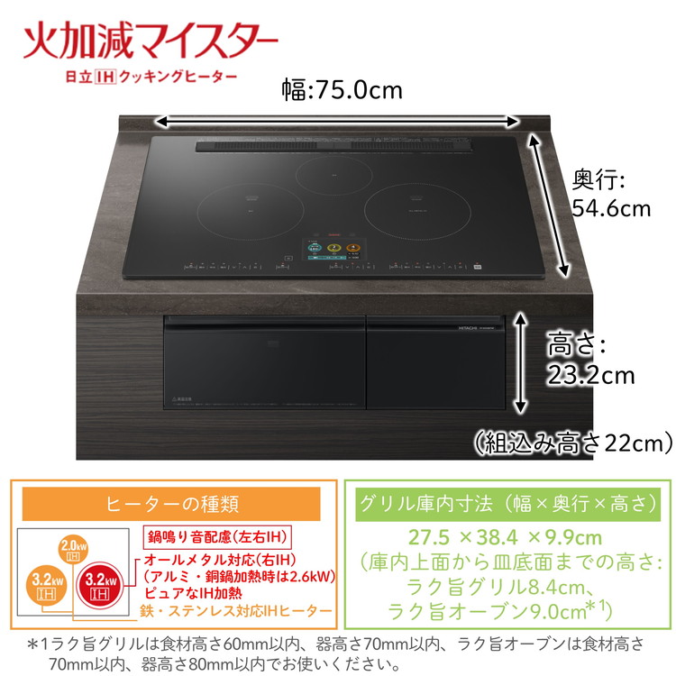 | 火力調整 | 左右IH:9段階 中央IH:8段階 |