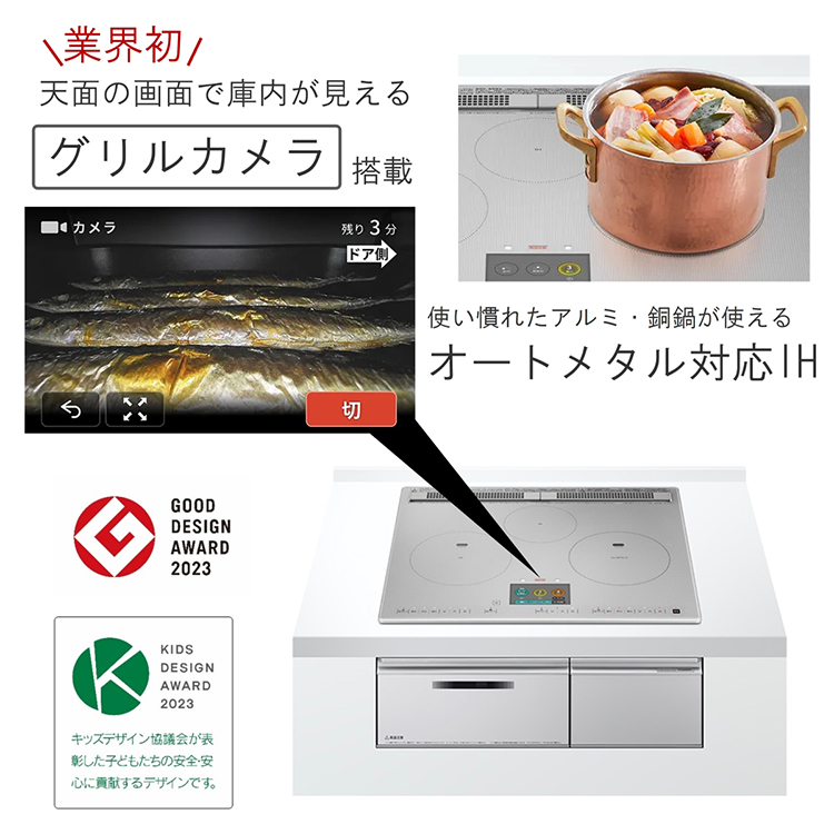 ドアを開けたり、かがんで覗きこんだりすることなく、天面の画面でグリル庫内がラクに見える「グリルカメラ」を搭載。
