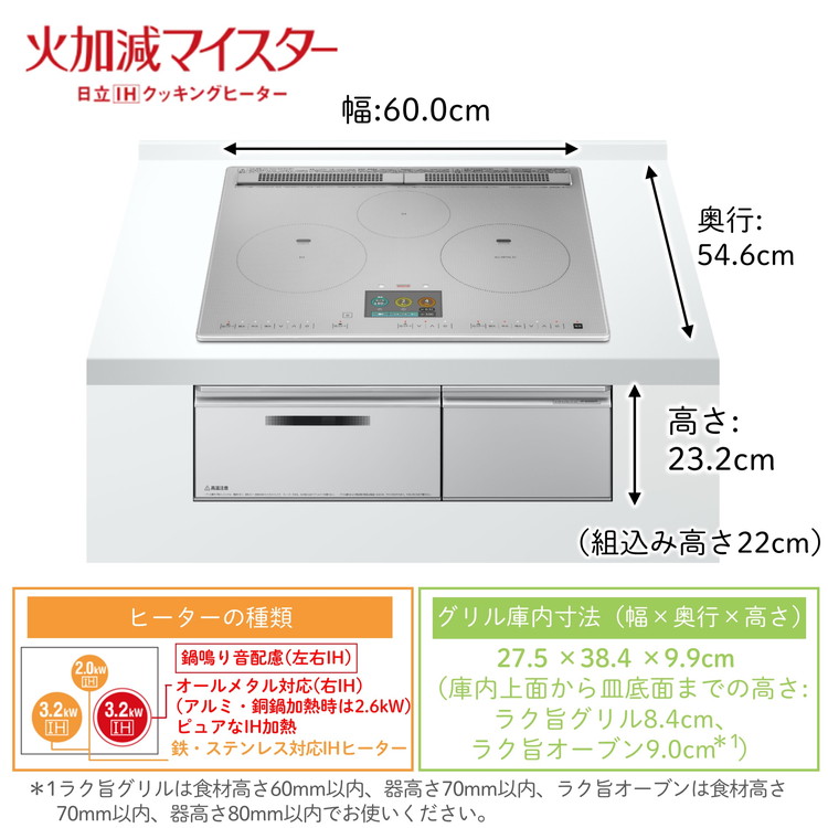 | 火力調整 | 左右IH:9段階 中央IH:8段階 |