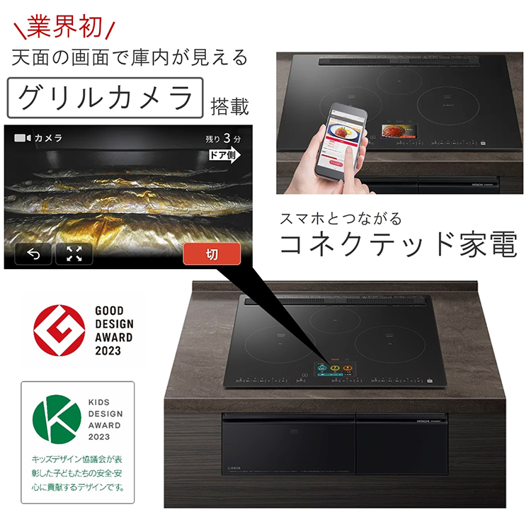 ドアを開けたり、かがんで覗きこんだりすることなく、天面の画面でグリル庫内がラクに見える「グリルカメラ」を搭載。