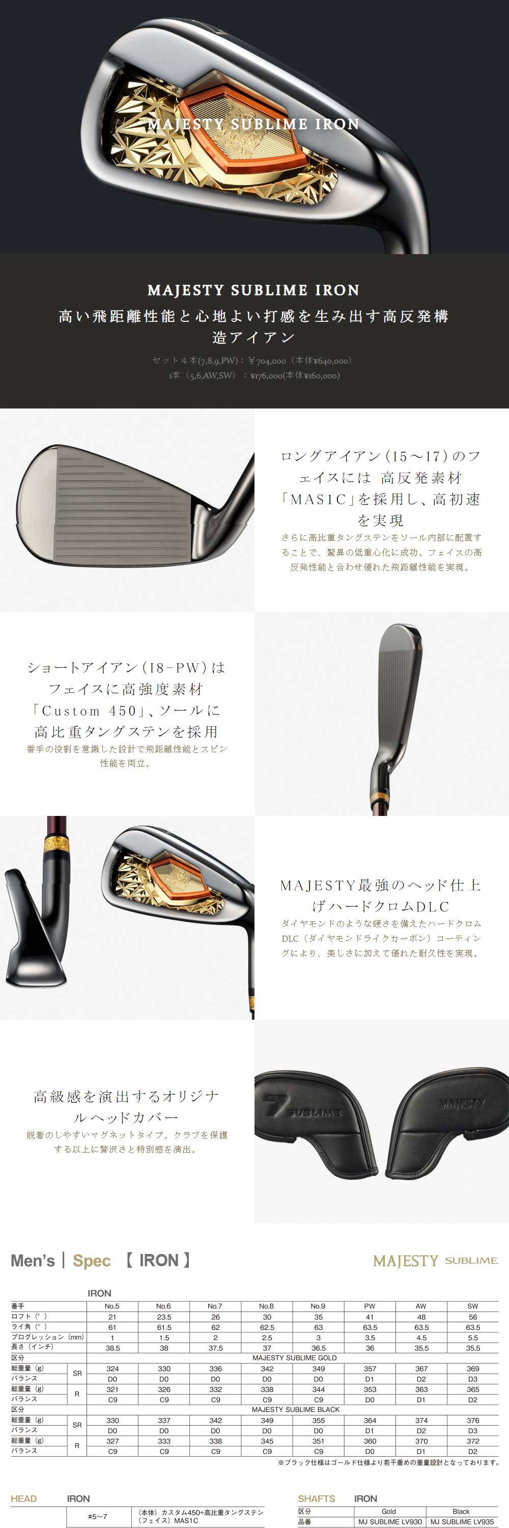 【日本正規品】 マジェスティ ゴルフ MAJESTY SUBLIME GOLD(マジェスティサブライムゴールド) アイアンセット4本組(#7-9、PW) 2023年モデル MJ SUBLIME LV930 ゴールド カーボンシャフト SR