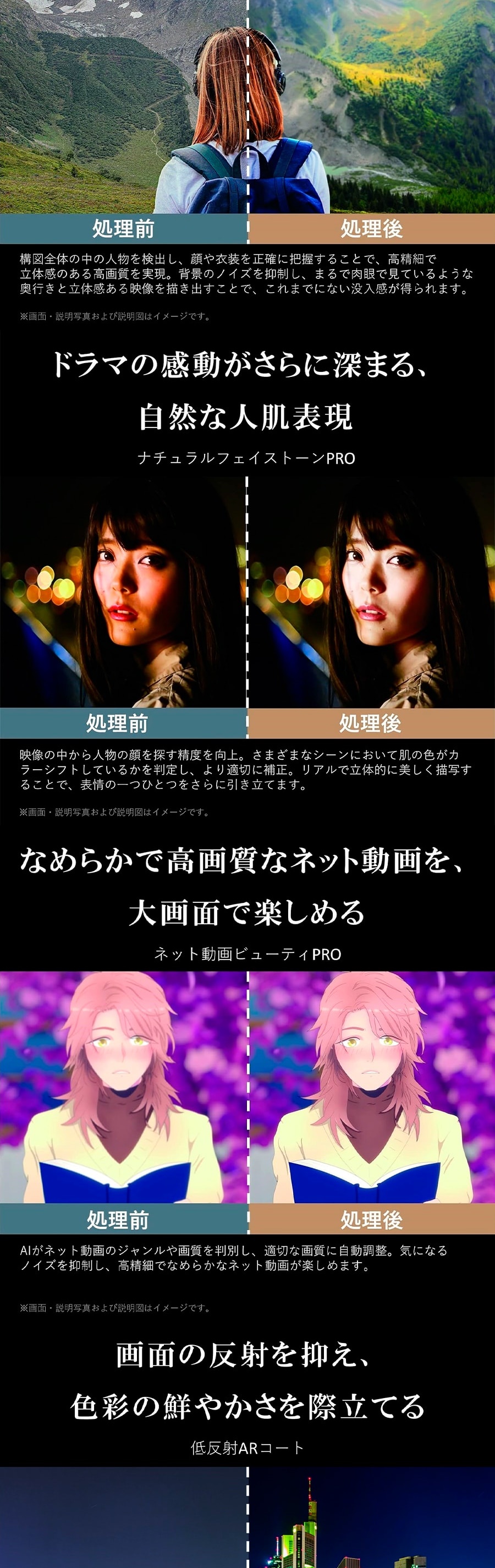 肌の質感やなめらかさの再現性を高め、服の質感や髪の毛のディテールもリアルに描き出します。背景のノイズを抑制し、まるで肉眼で見ているような奥行きと立体感ある映像を描き出し、これまでにない没入感が得られます。