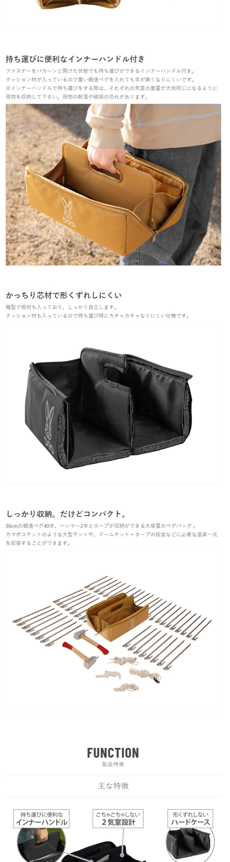 30cmの鍛造ペグ40本、ハンマー2本とロープが収納ができる大容量のペグバッグ 。