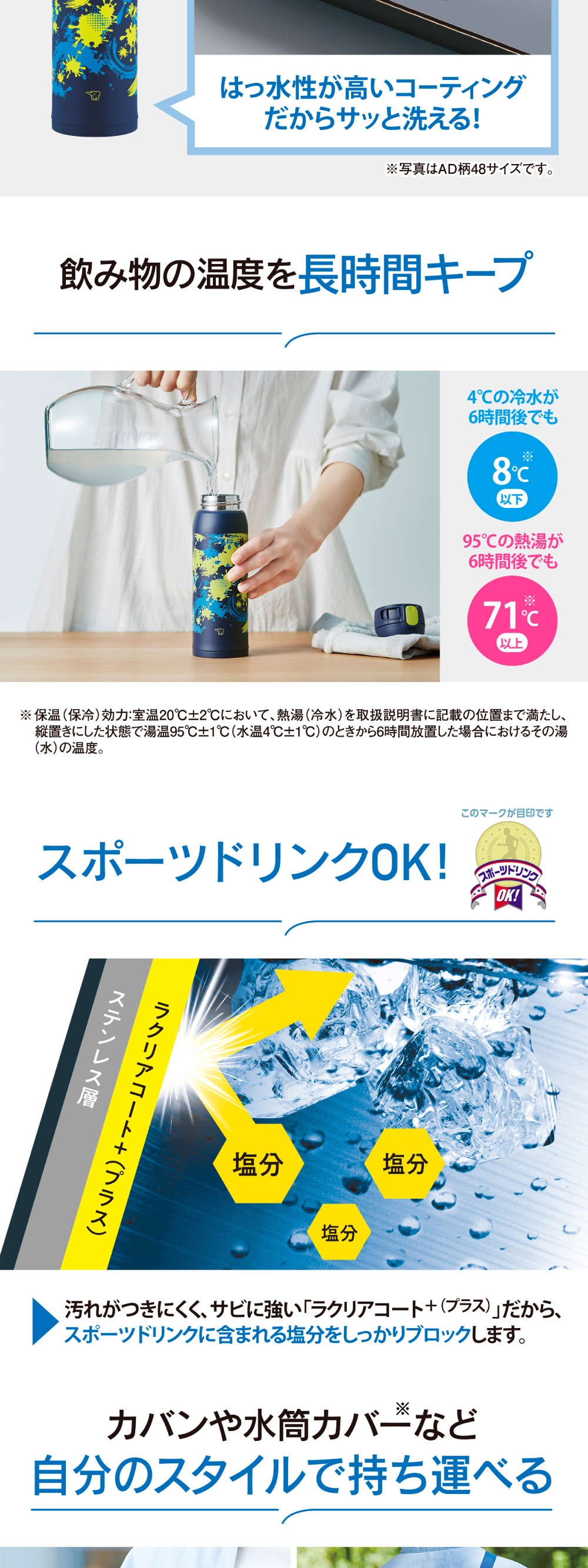 ※ 保温(保冷)効力とは、室温20℃±2℃において製品に熱湯(冷水)を取扱説明書に記載の位置まで満たし、ふたをつけて縦置きにした状態で湯温が95℃±1℃(水温が4℃±1℃)の時から6時間放置した場合におけるその湯(水)の温度。
