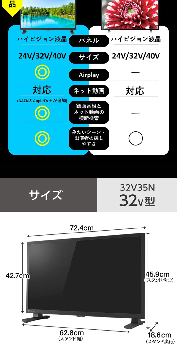 スタンダードモデルのハイビジョン液晶テレビ(32V型)。「ざんまいスマートアクセス」で、ネット動画も放送番組も好きなタレントの出演番組が見つかる。