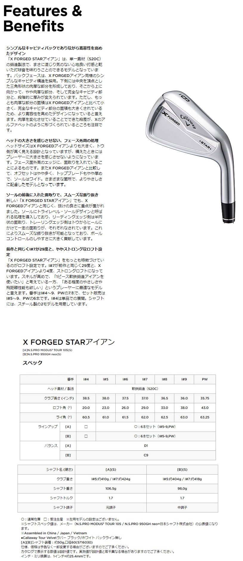 「X FORGED STARアイアン」をもっとも特徴づけているのがロフト設定です。I#7が前作と同じく29度と、X FORGEDアイアンより4度、ストロングロフトになっています。スキルが高めで、「1ピース軟鉄鍛造アイアンを使いたい」と考えている一方、「ある程度のやさしさや飛距離性能も欲しい」というプレーヤーに最適なモデルと言えます。番手はI#4~9、PWの7本で、セット販売はI#5~9、PWの6本です。I#4は単品での展開。シャフトには、スチール製の2モデルを用意しています。