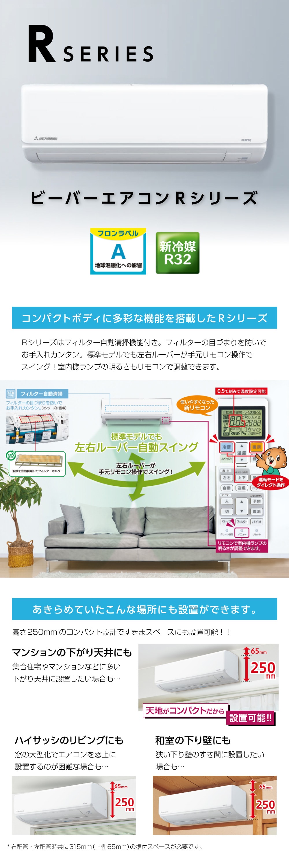 ※右配管・左配管時共に315mm(上側65mm)の据付スペースが必要です。