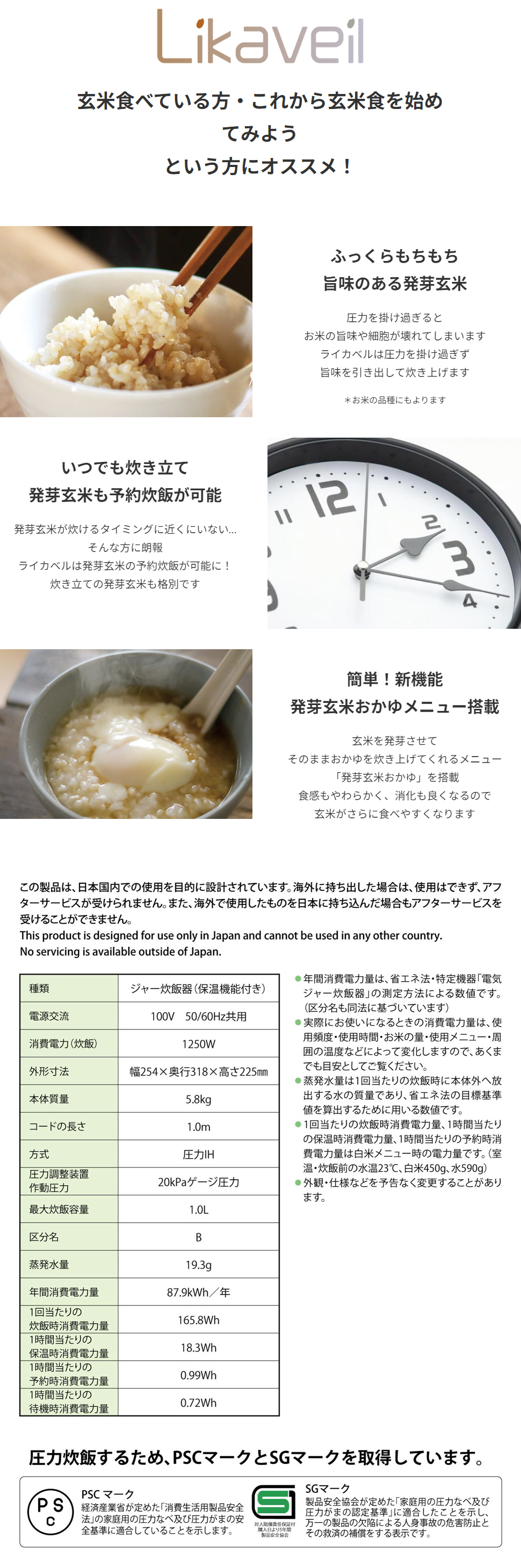 | 保温時間 | 発芽玄米:72時間まで 玄米・雑穀米・白米:12時間まで |