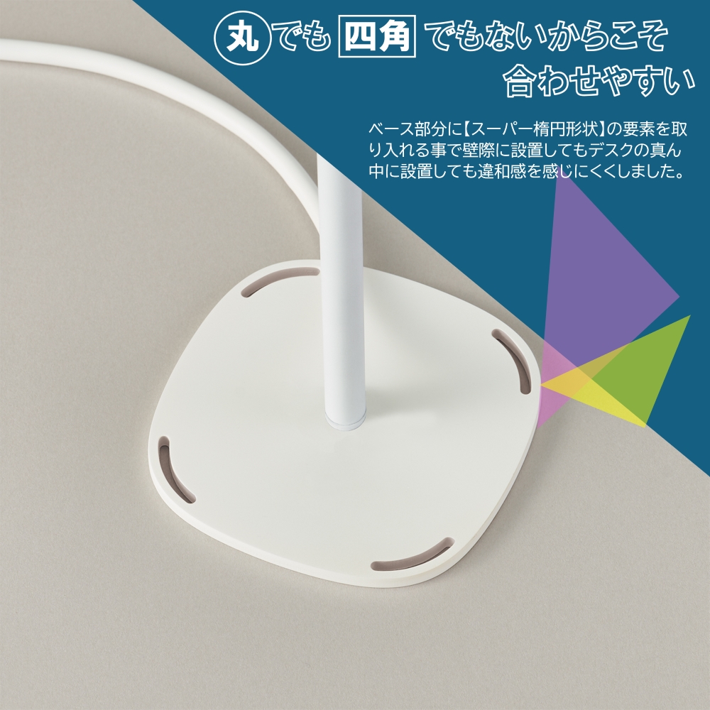 従来のベースタイプは壁際に設置する場合は四角形状、デスクの真ん中に寄せて設置する場合は丸い形状が好まれましたが、ZR-30はベース部分に「スーパー楕円形状」の要素を取り入れる事で壁際に設置してもデスクの真ん中に設置しても違和感を感じにくくしました。