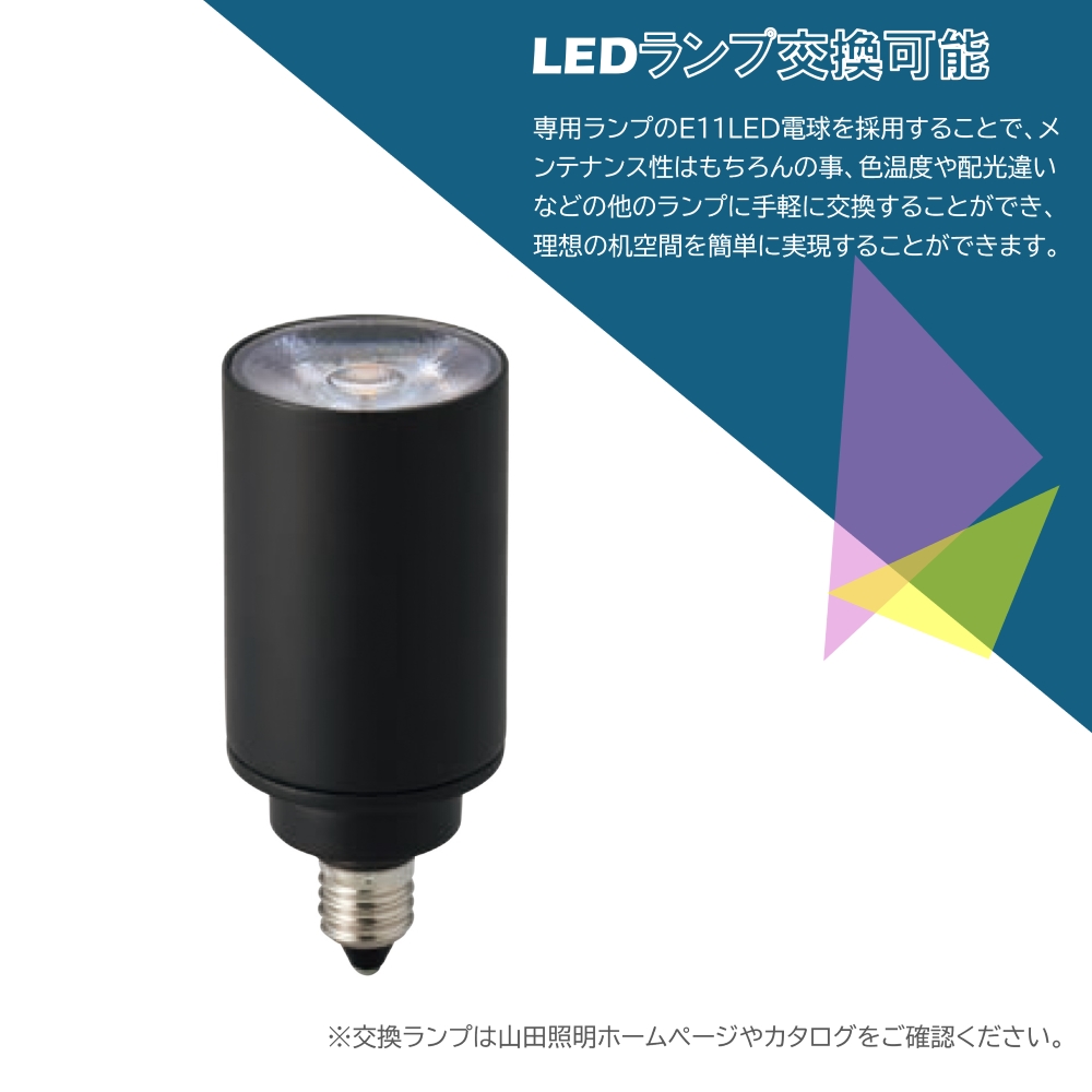 専用ランプのE11LED電球を採用することで、メンテナンス性はもちろんの事、色温度や配光違いなどの他のランプに手軽に交換することができ、理想の机空間を簡単に実現することができます。