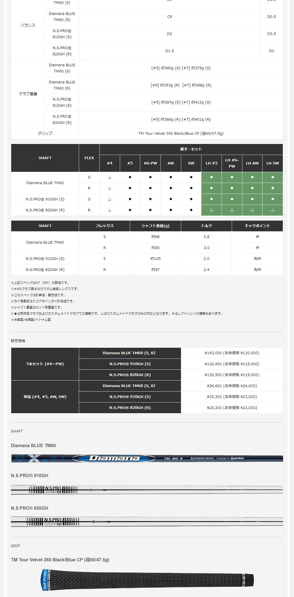 | 長さ | 6I:37.875インチ 7I:37.25インチ 8I:36.75インチ 9I:36.25インチ PW:35.75インチ |