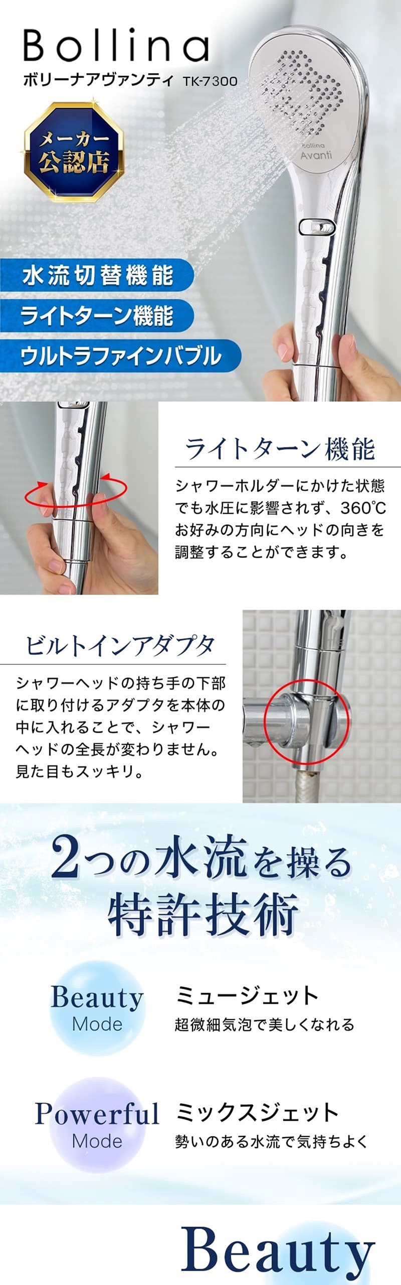 水中の空気を利用して超微細な泡を生み出す独自技術「μ-Jet(ミュージェット)機構」により直径0.0001mmのウルトラファインバブルを1ccあたり約1億個も生成。(ウルトラファインバブルとは、直径0.0001mm未満の泡のこと。)