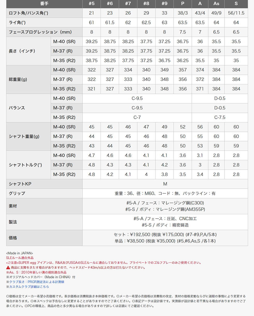 | ヘッド構造 | ボディ:マレージング鋼 AM355P(精密鋳造) フェース:マレージング鋼 C300(圧延、CNC加工) |