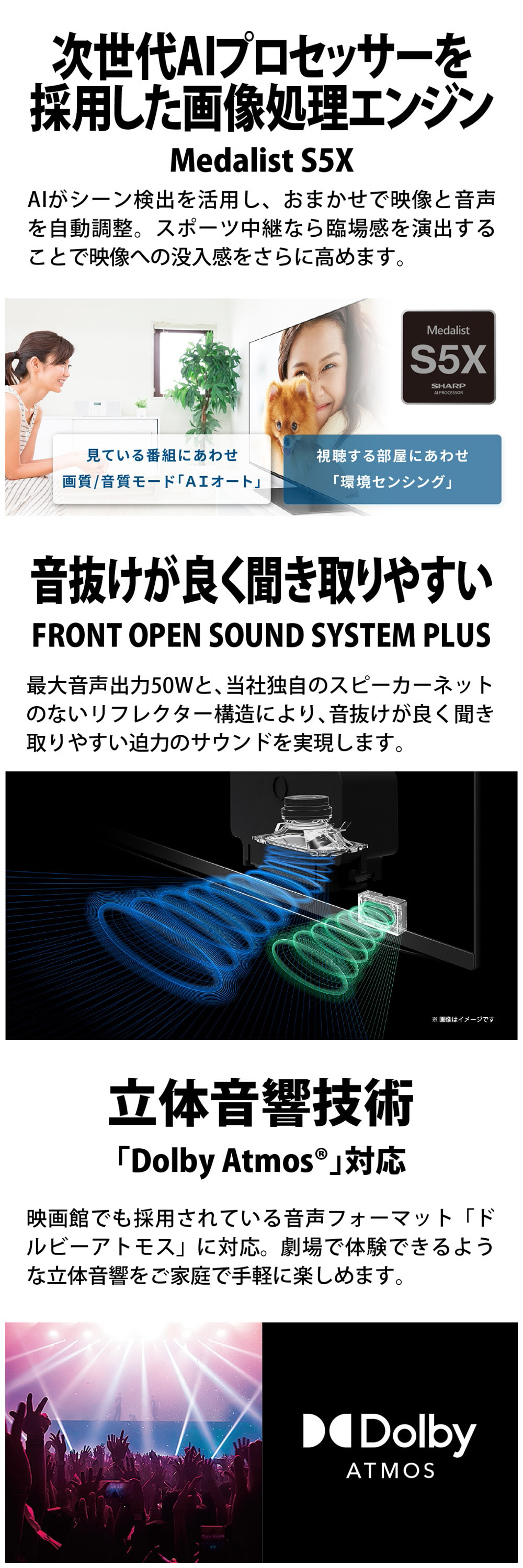 最大音声出力50Wと、シャープ独自のスピーカーネットのないリフレクター構造により、音抜けが良く聞き取りやすい迫力のサウンドを実現します。