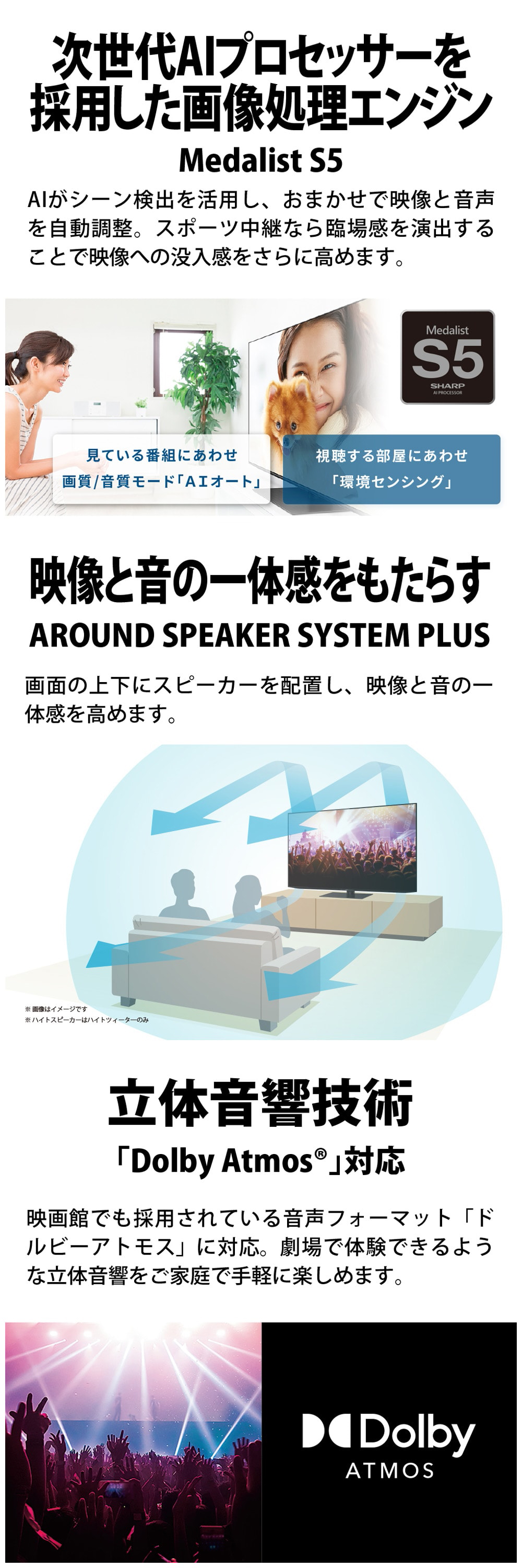 映画館でも採用されている音声フォーマット「ドルビーアトモス」に対応。劇場で体験できるような立体音響をご家庭で気軽に楽しめます。