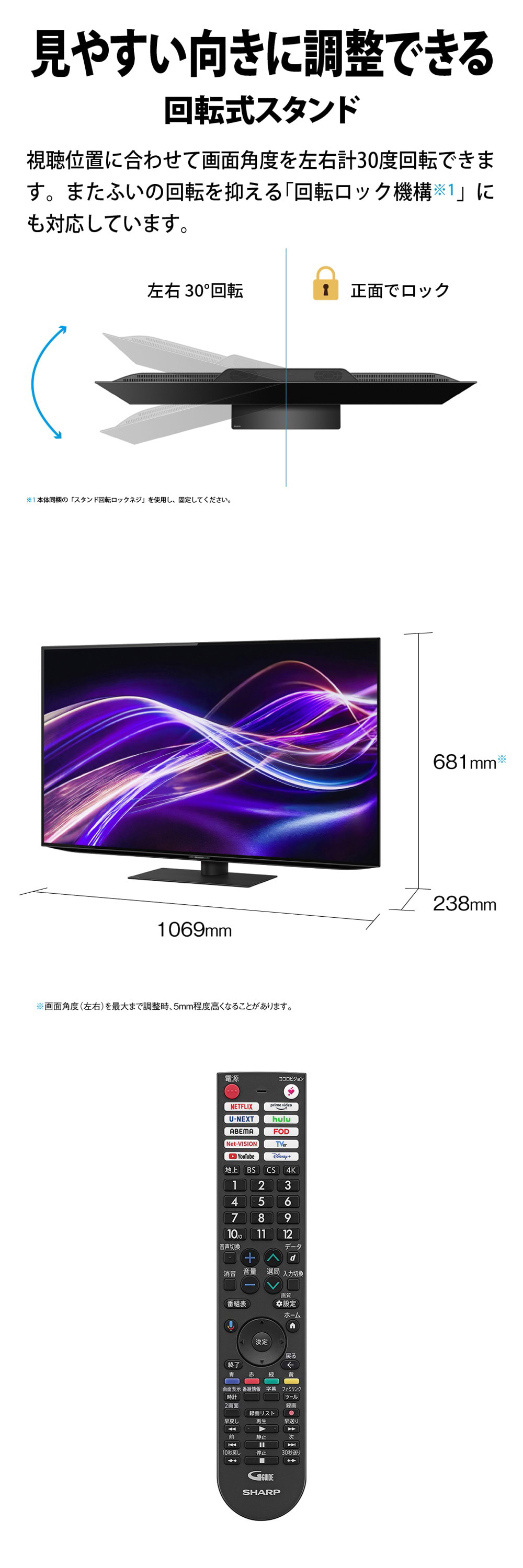 視聴位置に合わせて画面角度を左右計30度回転できます。またふいの回転を抑える「回転ロック機構※」にも対応しています。