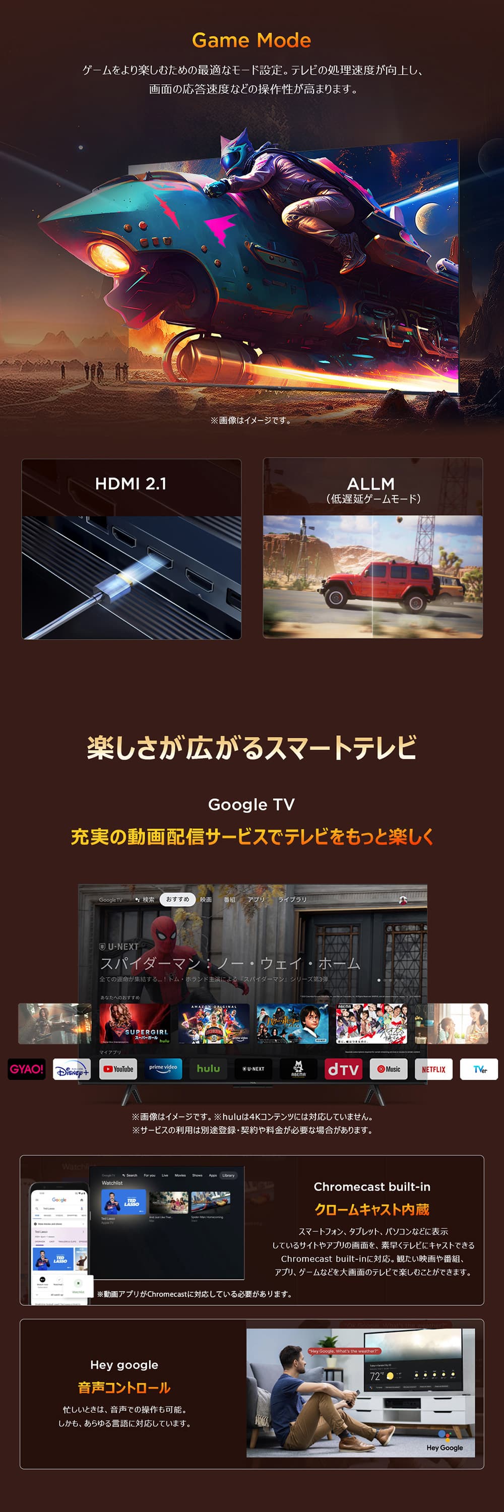 ミラーキャスト、クロームキャスト搭載、スマートフォンで見ている映像やゲームなどをテレビの大画面でお気軽に楽しめます。