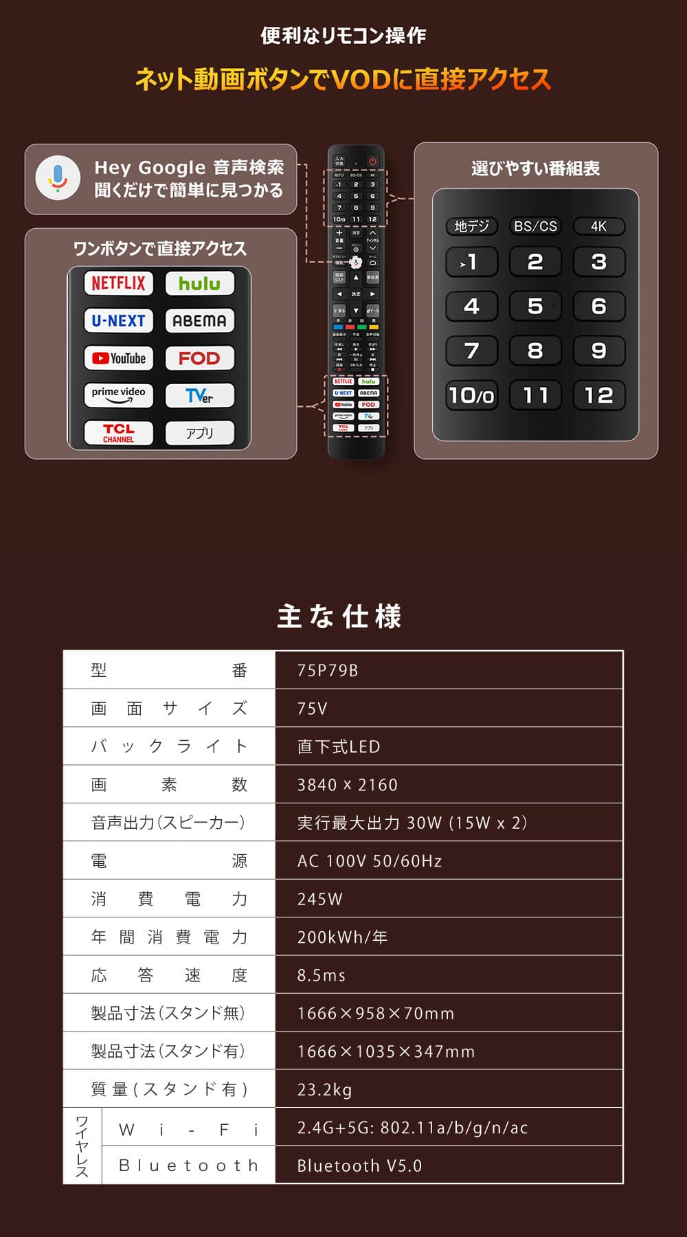 TCL 75P79B [75V型 地上・BS・CSデジタル 4K内蔵 液晶テレビ]