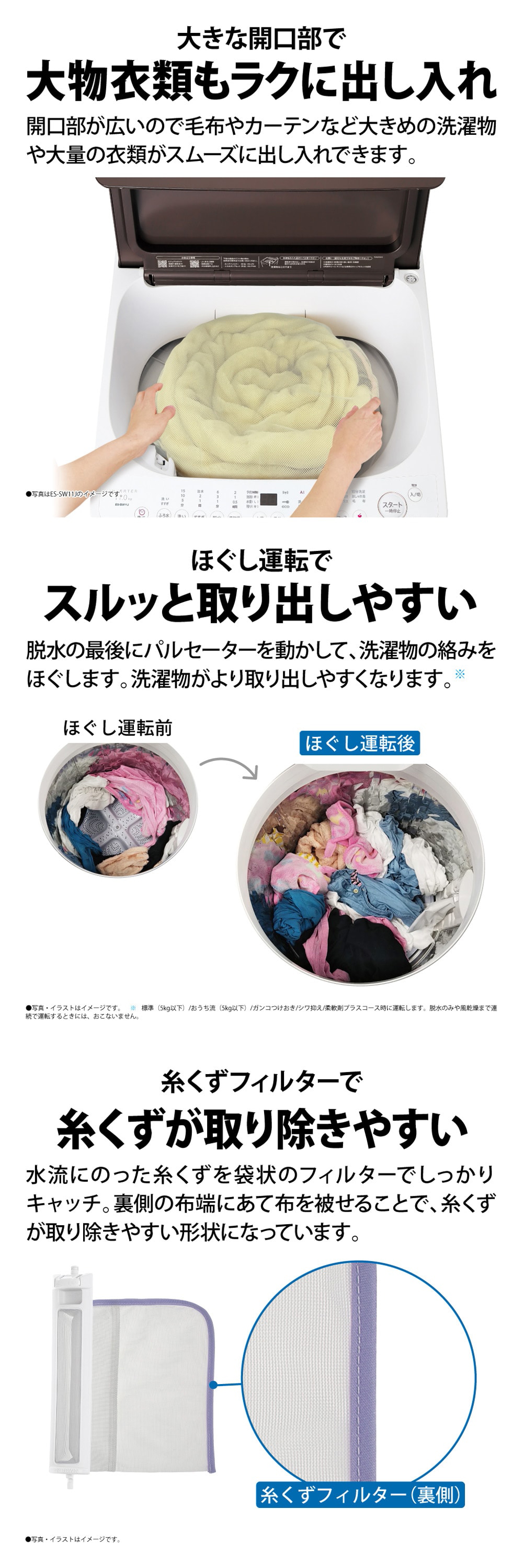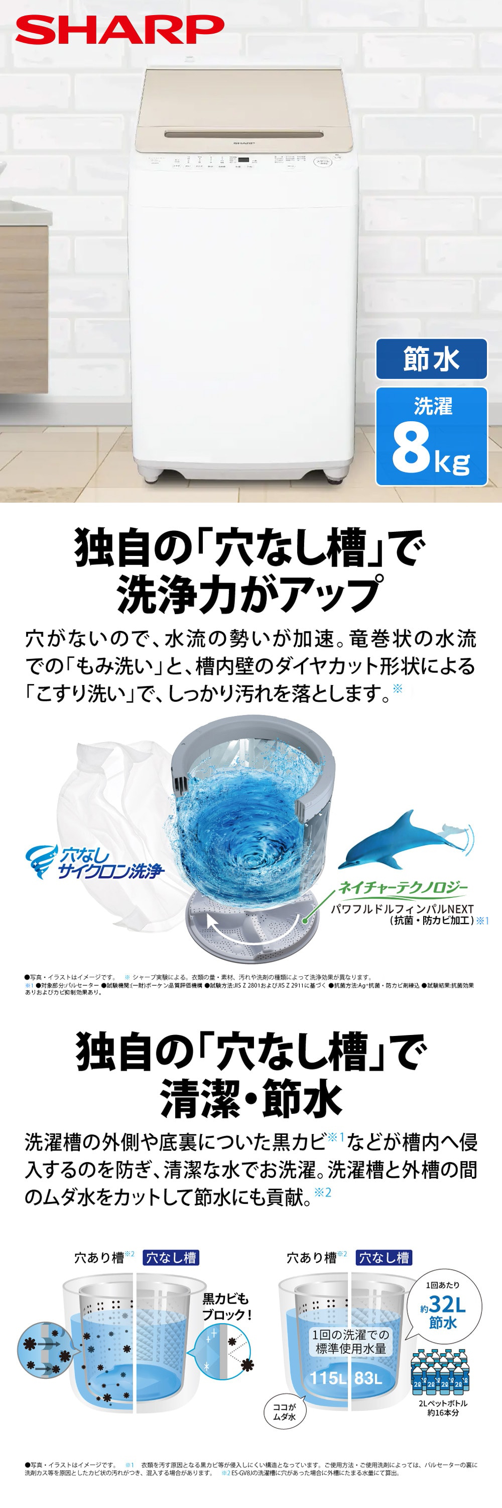 ※1 シャープ実験による。衣類の量・素材、汚れや洗剤の種類によって洗浄効果が異なります。