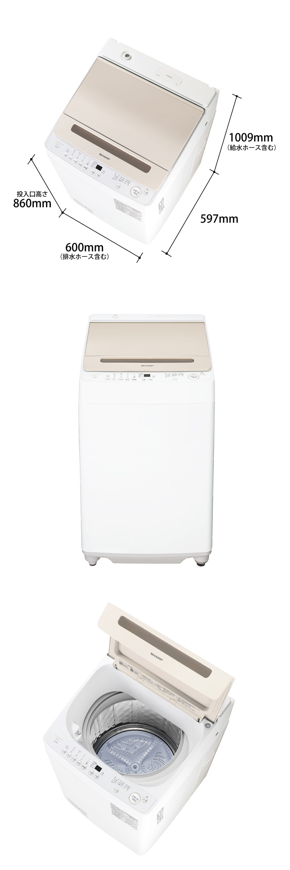 | 幅x高さx奥行き | 幅(ボディ幅)×高さ×奥行:600(555)×1009×597 幅は排水ホース、高さは給水ホースを含む mm |