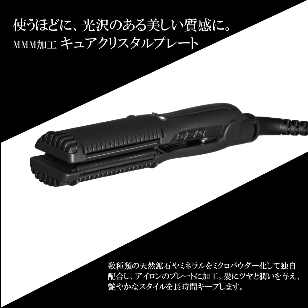 また、特殊加工されたアイロンプレートから発せられる「テラヘルツ波(育成光線)」による皮膜形成効果で、キューティクルを引き締め、ツヤのある美しい髪へと導きます。