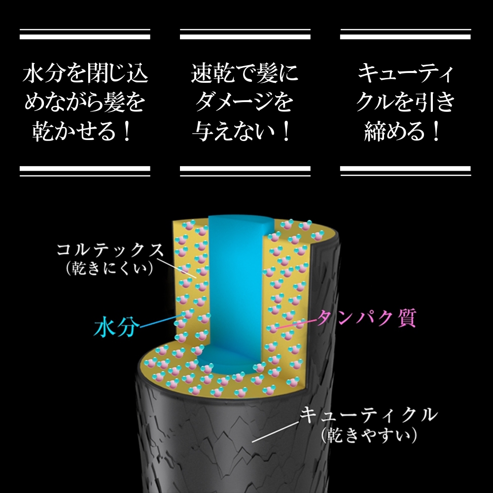 一般的なドライヤーで使用されるモーターに比べ、モーターの回転数が高いブラシレスDCモーターを搭載。