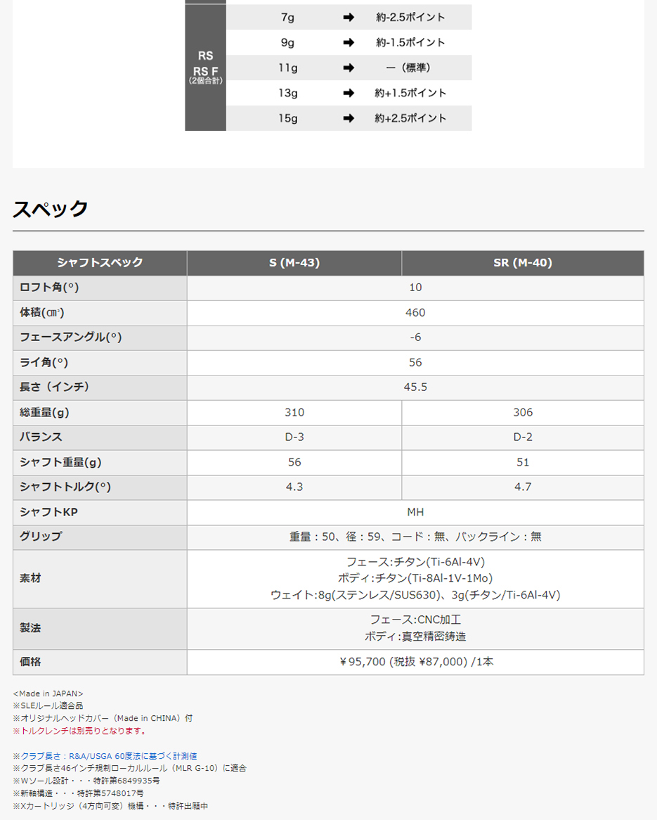 ・ウェイト:8g(ステンレス/SUS630)、3g(チタン/Ti-6Al-4V)