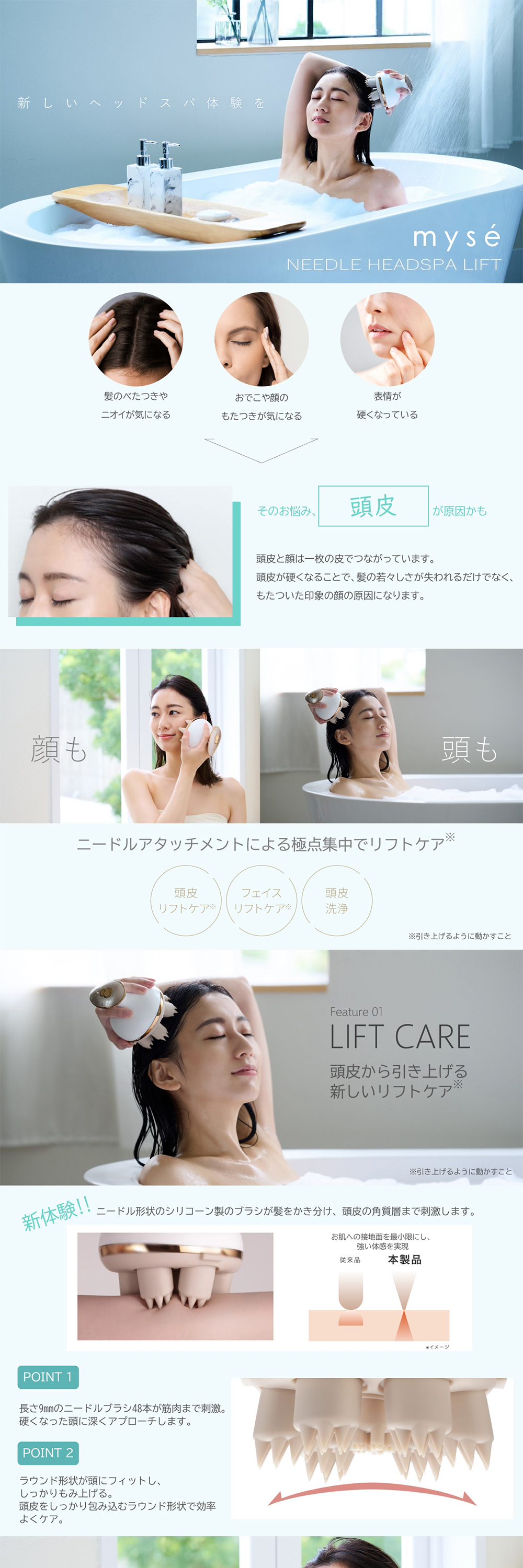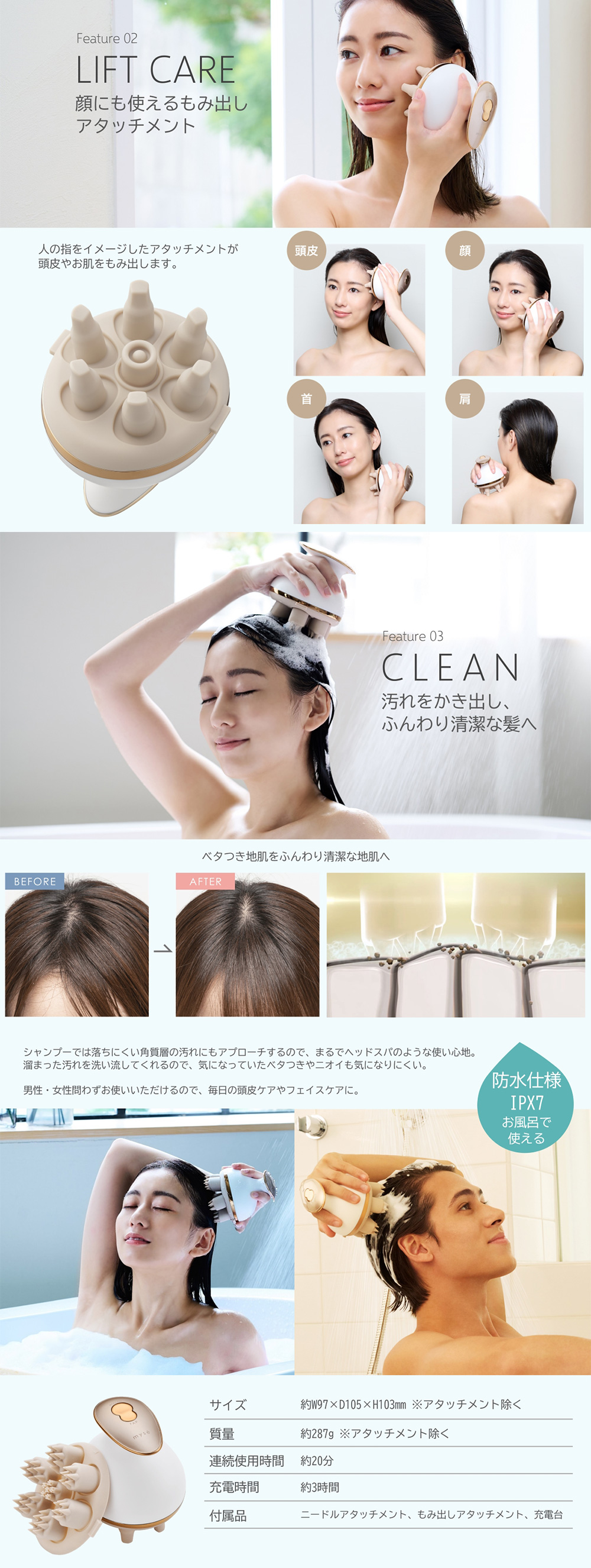 「ニードルアタッチメント」と「もみ出しアタッチメント」の2種類のアタッチメントで、頭皮のケアから顔のリフトケアまで。