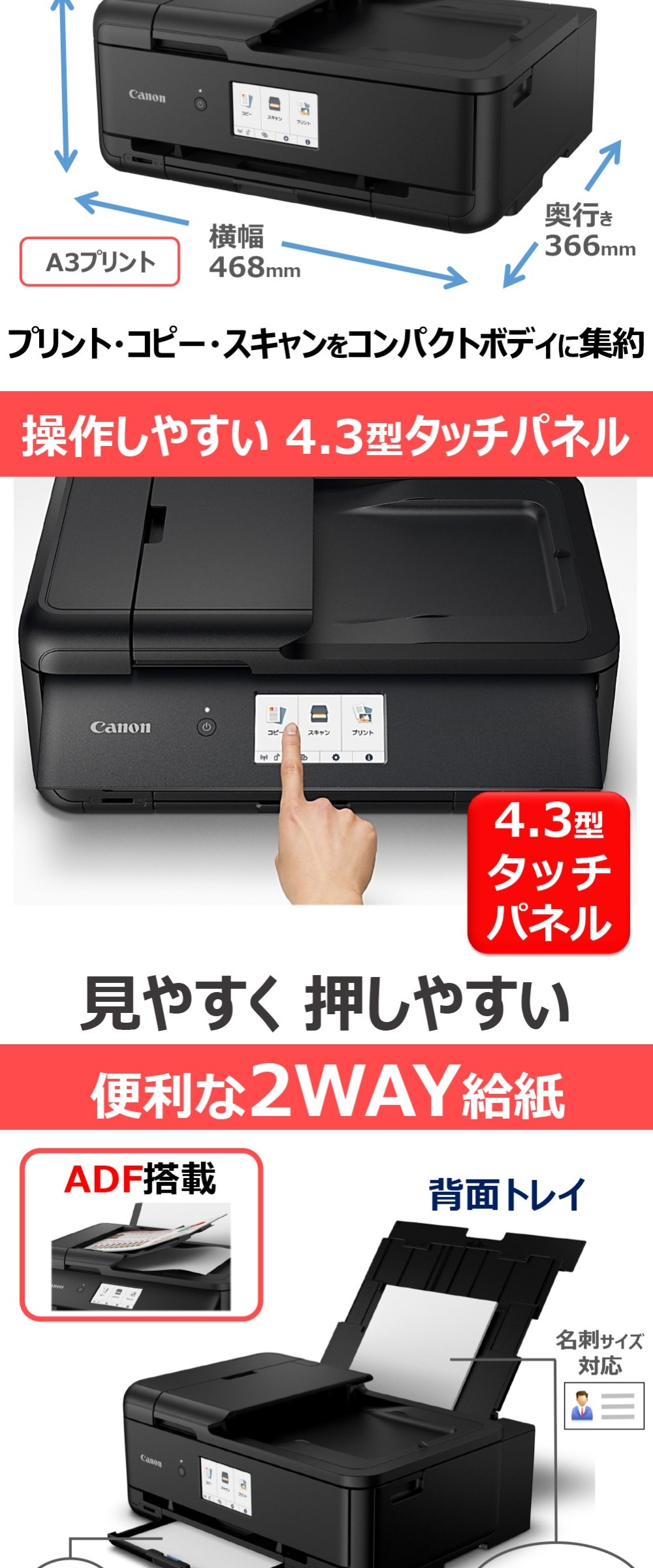 | その他機能 | ダイレクト印刷 ネットワーク印刷 自動両面印刷 フチなし印刷 レーベル印刷 自動原稿送り装置(ADF) カードリーダー |