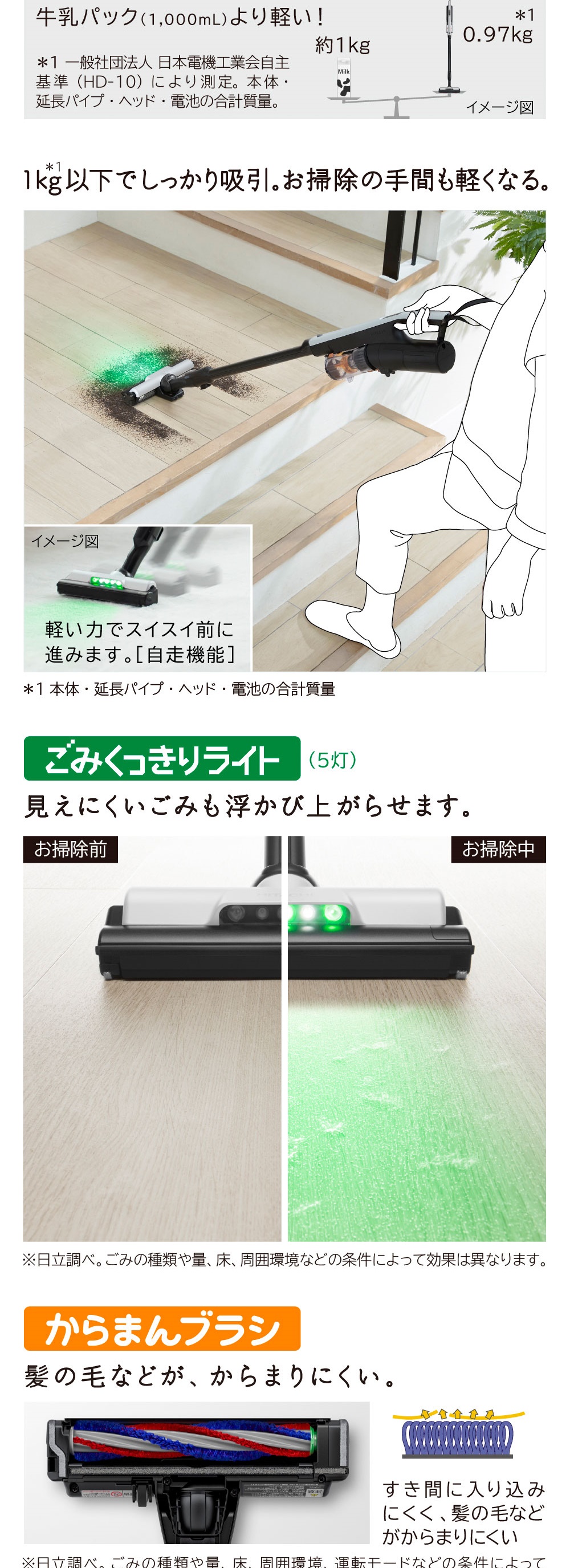 本製品は、1000mLの牛乳パック(約1kg)より軽い、日立スティッククリーナー史上最軽量(※)標準質量0.97kg。