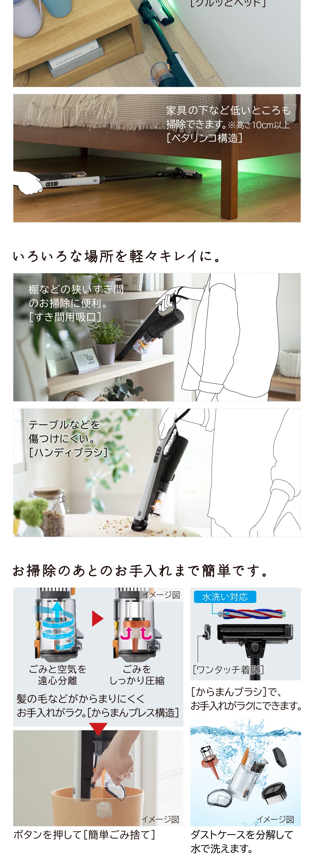 「ごみくっきりライト」を搭載し、合計5灯の緑色・白色LEDライトで、暗いところはもちろん明るいところでも、見えにくかったごみを浮かび上がらせます(※)。