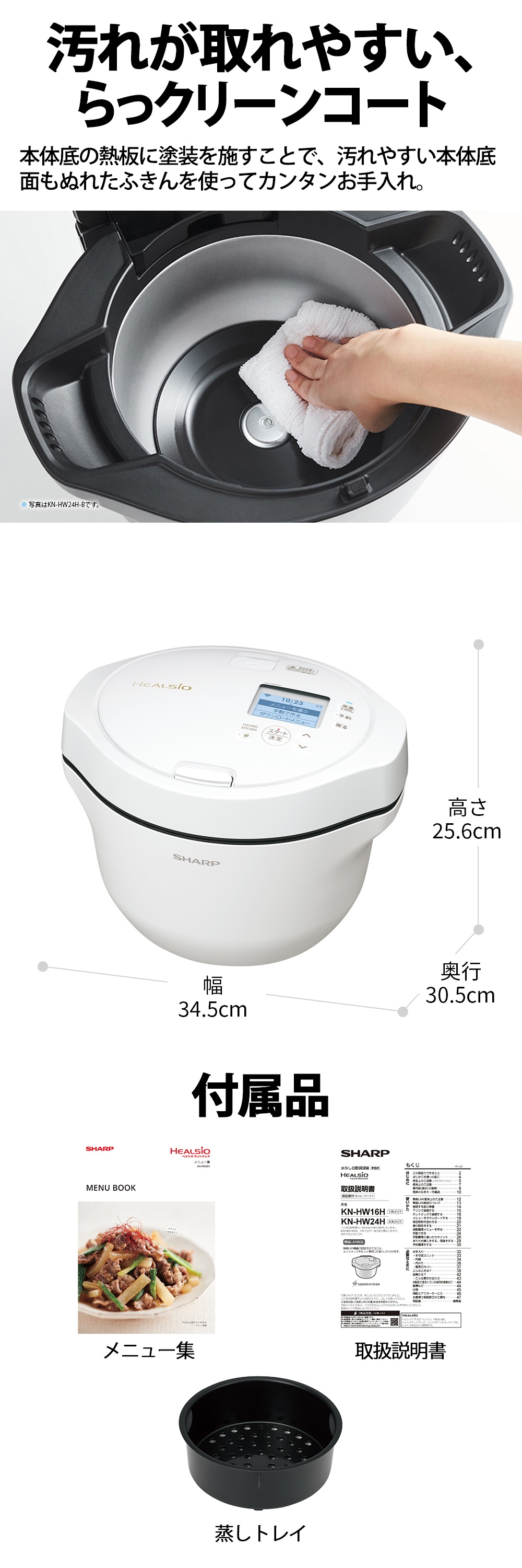 調味料などのシミや焦げ付きが残りやすい本体底の熱板に、汚れが落ちやすい「らっクリーンコート」を新たに採用。濡れたふきんで簡単にお手入れすることが可能です。