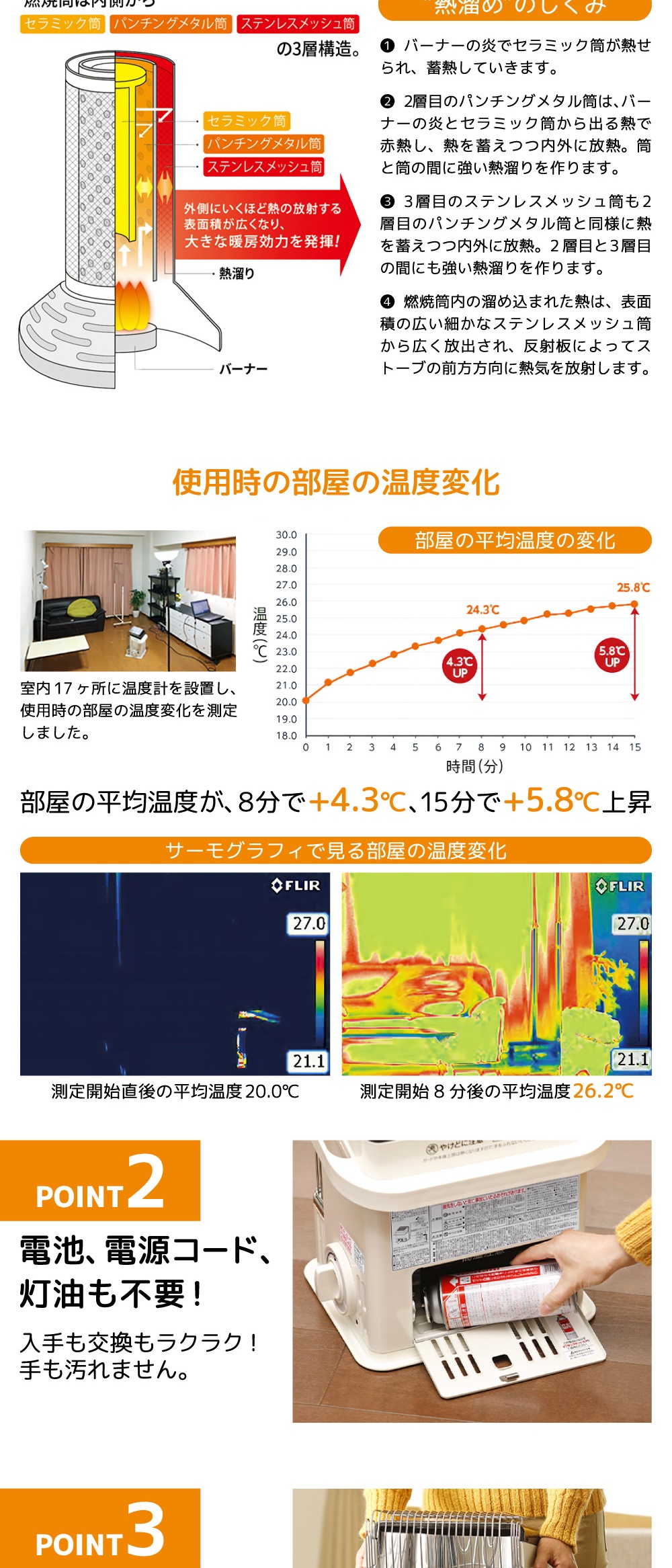 ★ 『熱溜め燃焼筒』によって少ないガス消費量でも暖かい暖房効力を発揮