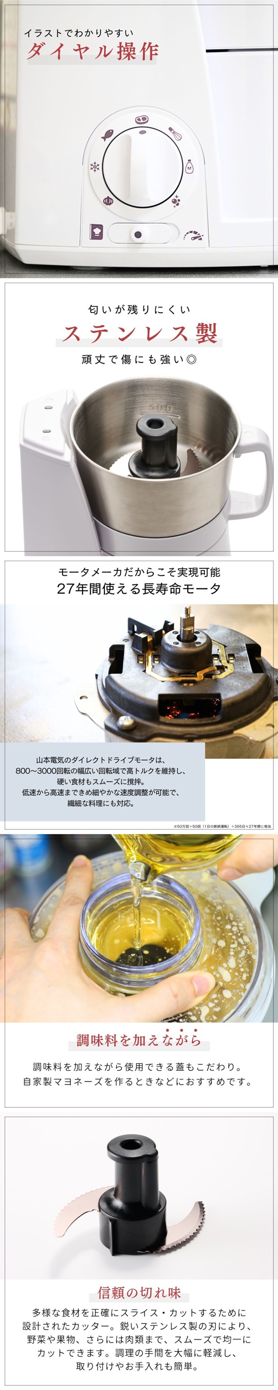 「きざむ」「する」「まぜる」「くだく」「あわだてる」「こねる」(ブレード)「おろす」(グレーター)の1台7役。