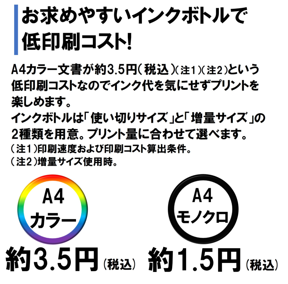 A4カラー文書約3.5円(税込)、L判写真約11.6円(インク用紙合計コスト・税込)の低印刷コストなのでインク代を気にせずにプリントを楽しめます。