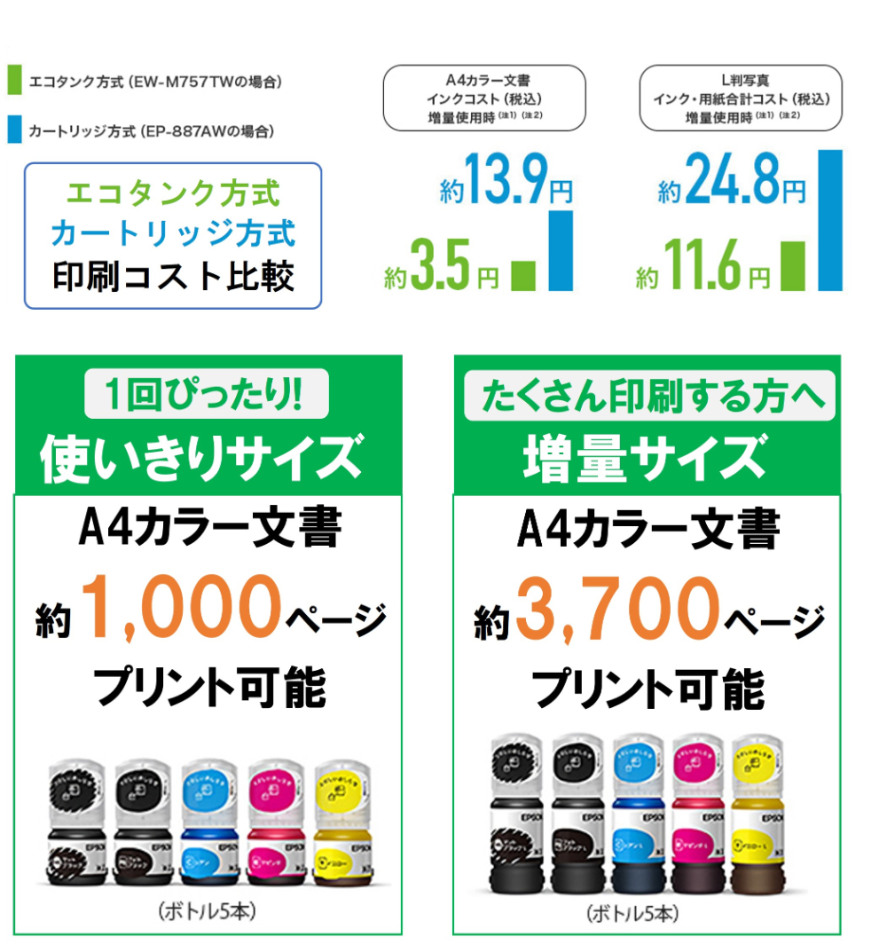インク補充の案内が出てからちょうど1回補充できる「使い切りサイズ」では、A4カラー文書を約1000ページ、複数回補充可能な「増量サイズ」では、約3700ページプリント可能。