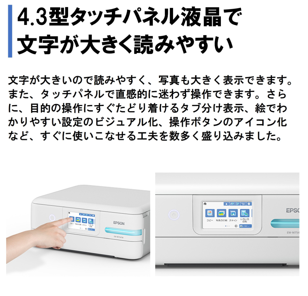 プリンター本体には、4.3型ワイドタッチパネル液晶、用紙をしまっておける前面カセット、排紙トレイ自動オープン機能などコンパクトなボディに便利な機能を搭載。