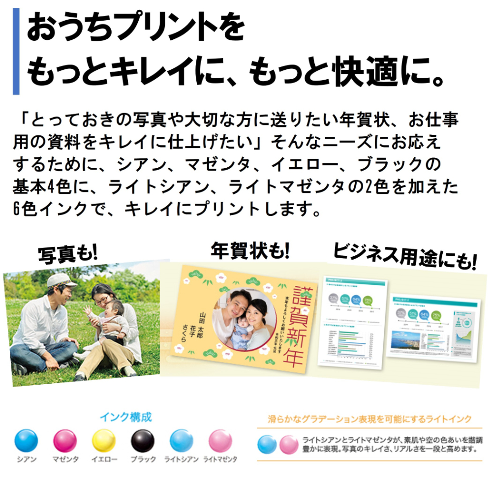 スタイリッシュ&コンパクトボディに6色インク搭載で写真も文書もキレイ!どなたでもお手軽にお使いいただけます。
