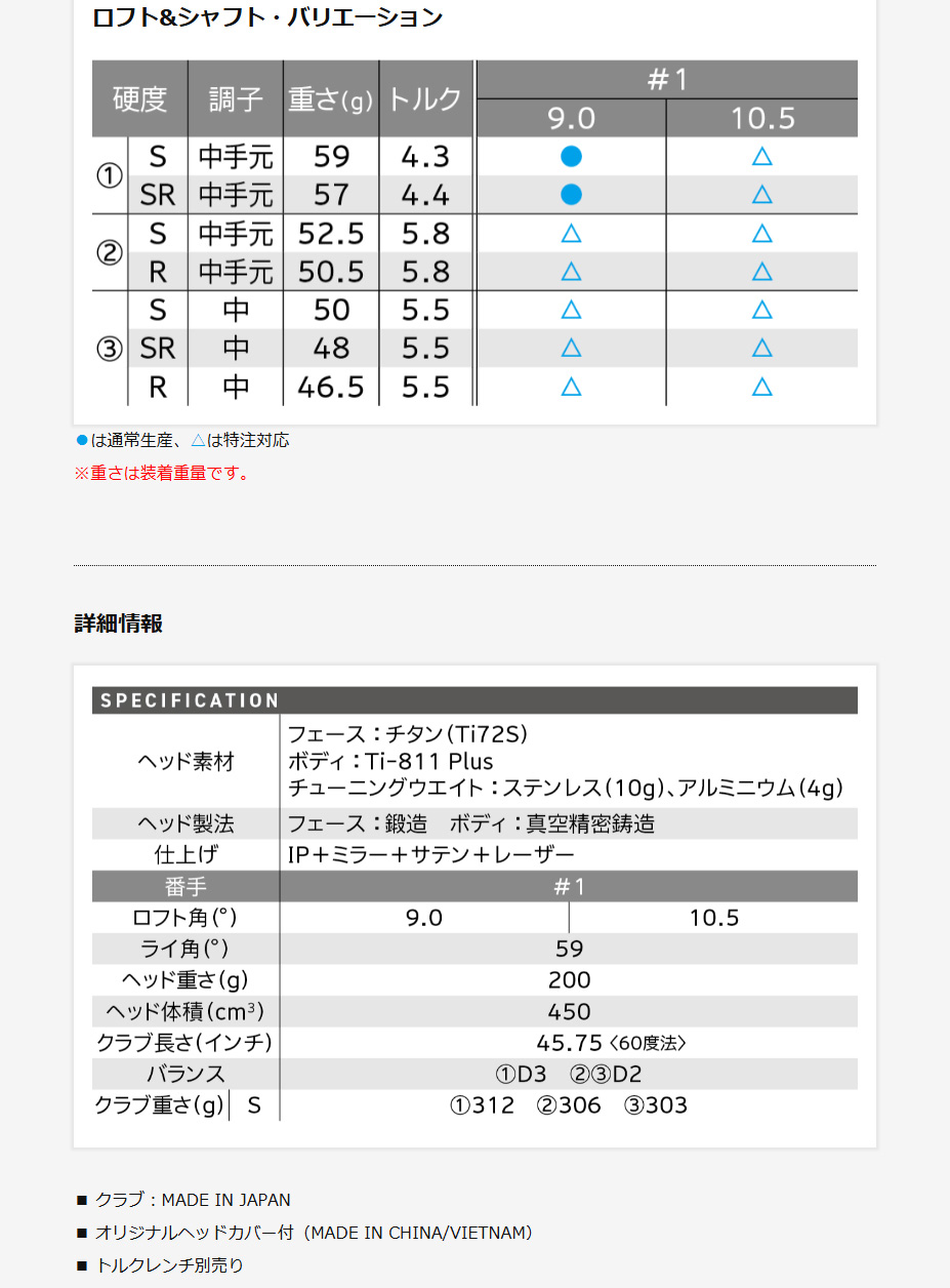 | ヘッド構造 | ボディ:Ti-811 Plus(真空精密鋳造) フェース:チタン Ti72S(鍛造) |