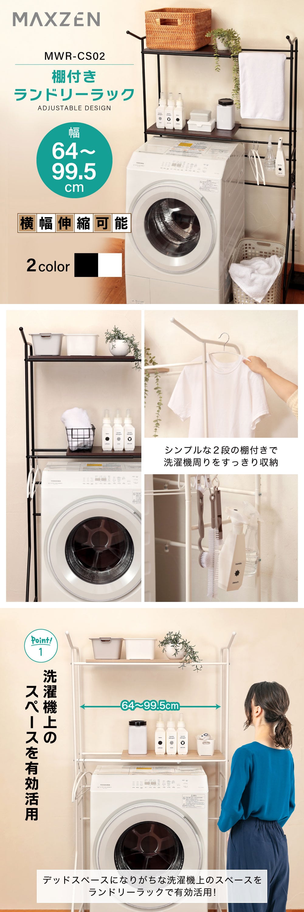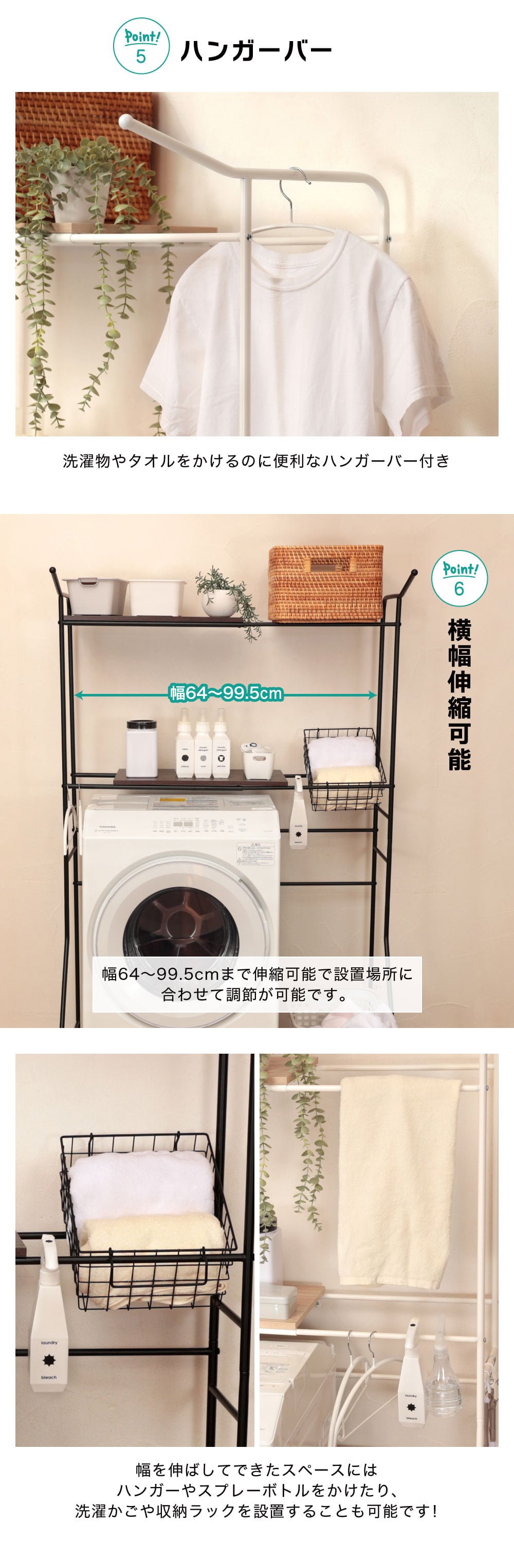 幅を伸ばしてできたスペースにはハンガーやスプレーボトルをかけたり、洗濯かごや収納ラックを設置することも可能です!