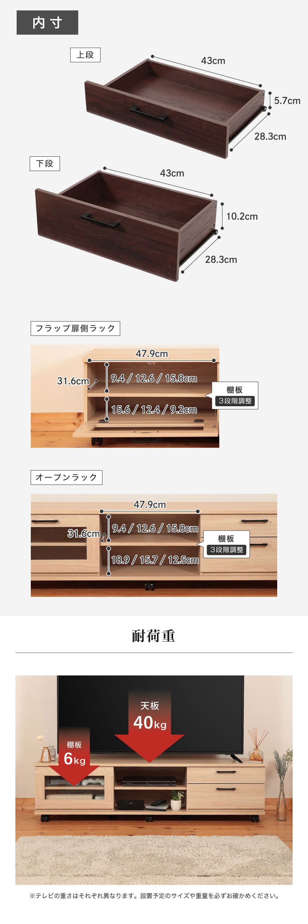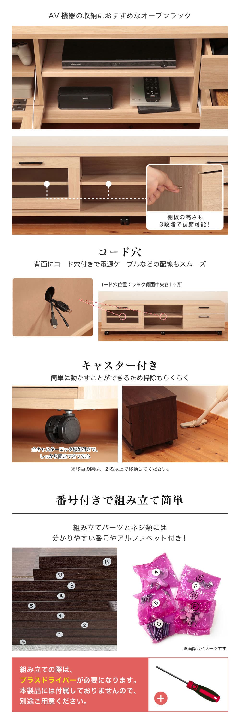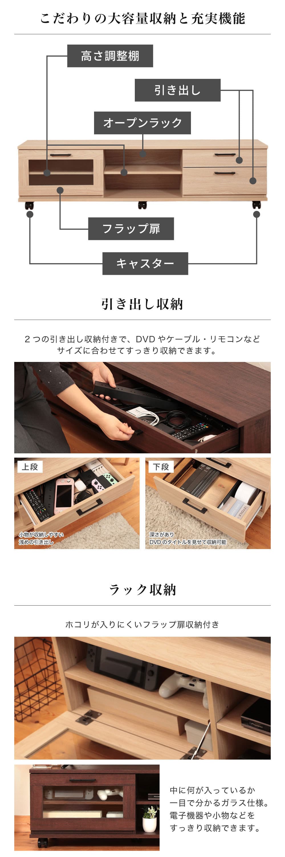 2つの引き出し収納付きで、DVDやケーブル・リモコンなどサイズに合わせてすっきり収納できます。