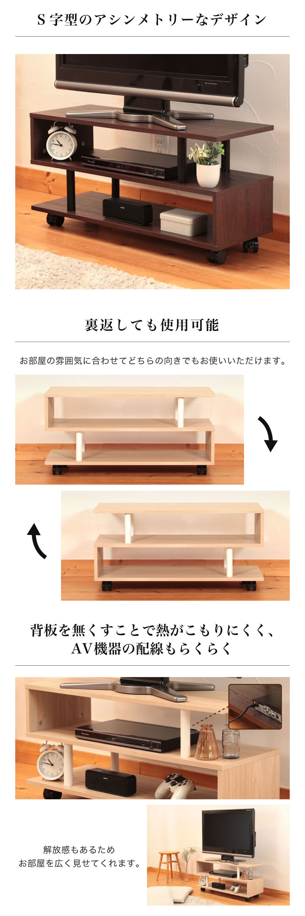 ★ 背板を無くすことで熱がこもりにくく、AV機器の配線もらくらく