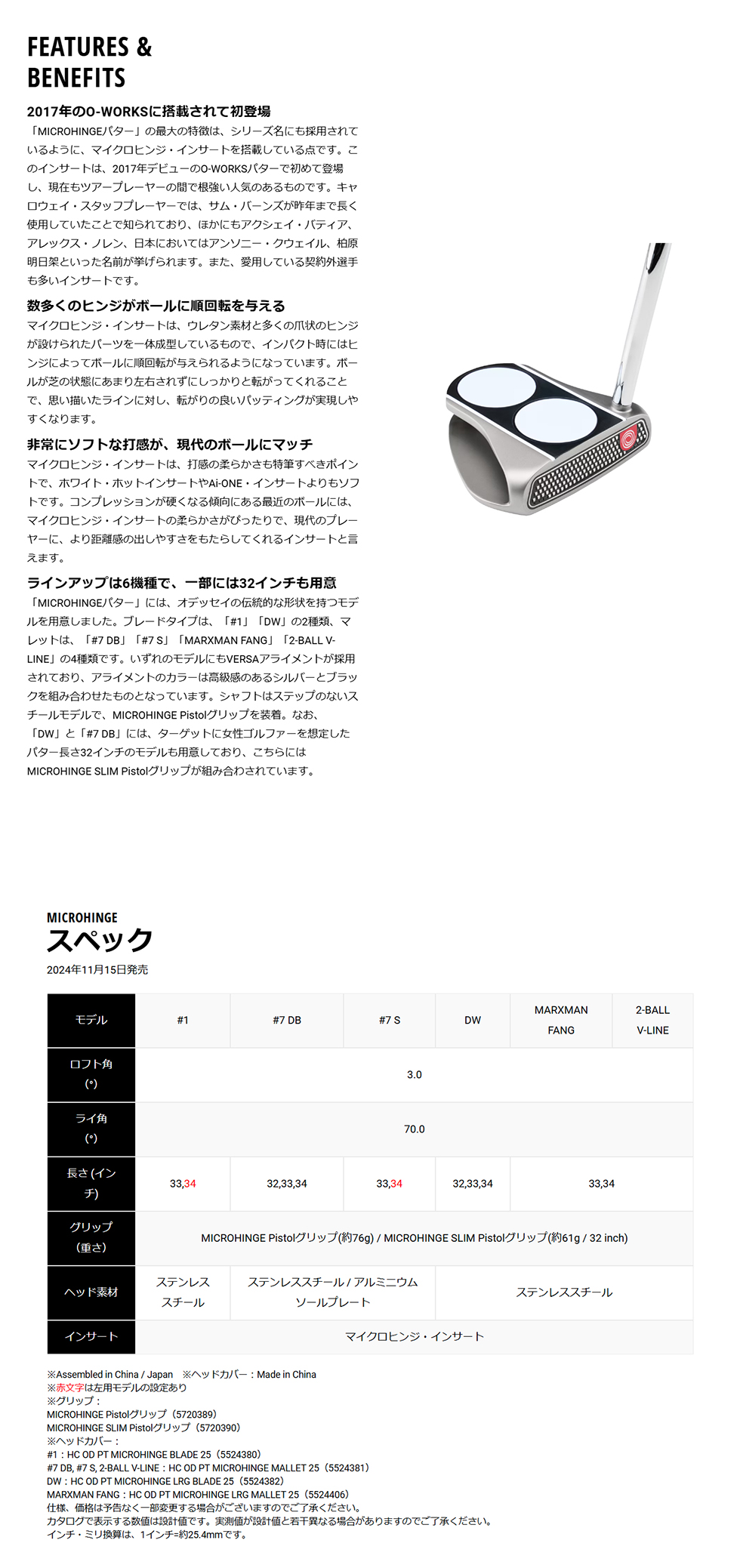 「MICROHINGEパター」には、オデッセイの伝統的な形状を持つモデルを用意しました。ブレードタイプは、「#1」「DW」の2種類、マレットは、「#7 DB」「#7 S」「MARXMAN FANG」「2-BALL V-LINE」の4種類です。いずれのモデルにもVERSAアライメントが採用されており、アライメントのカラーは高級感のあるシルバーとブラックを組み合わせたものとなっています。シャフトはステップのないスチールモデルで、MICROHINGE Pistolグリップを装着。なお、「DW」と「#7 DB」には、ターゲットに女性ゴルファーを想定したパター長さ32インチのモデルも用意しており、こちらにはMICROHINGE SLIM Pistolグリップが組み合わされています。