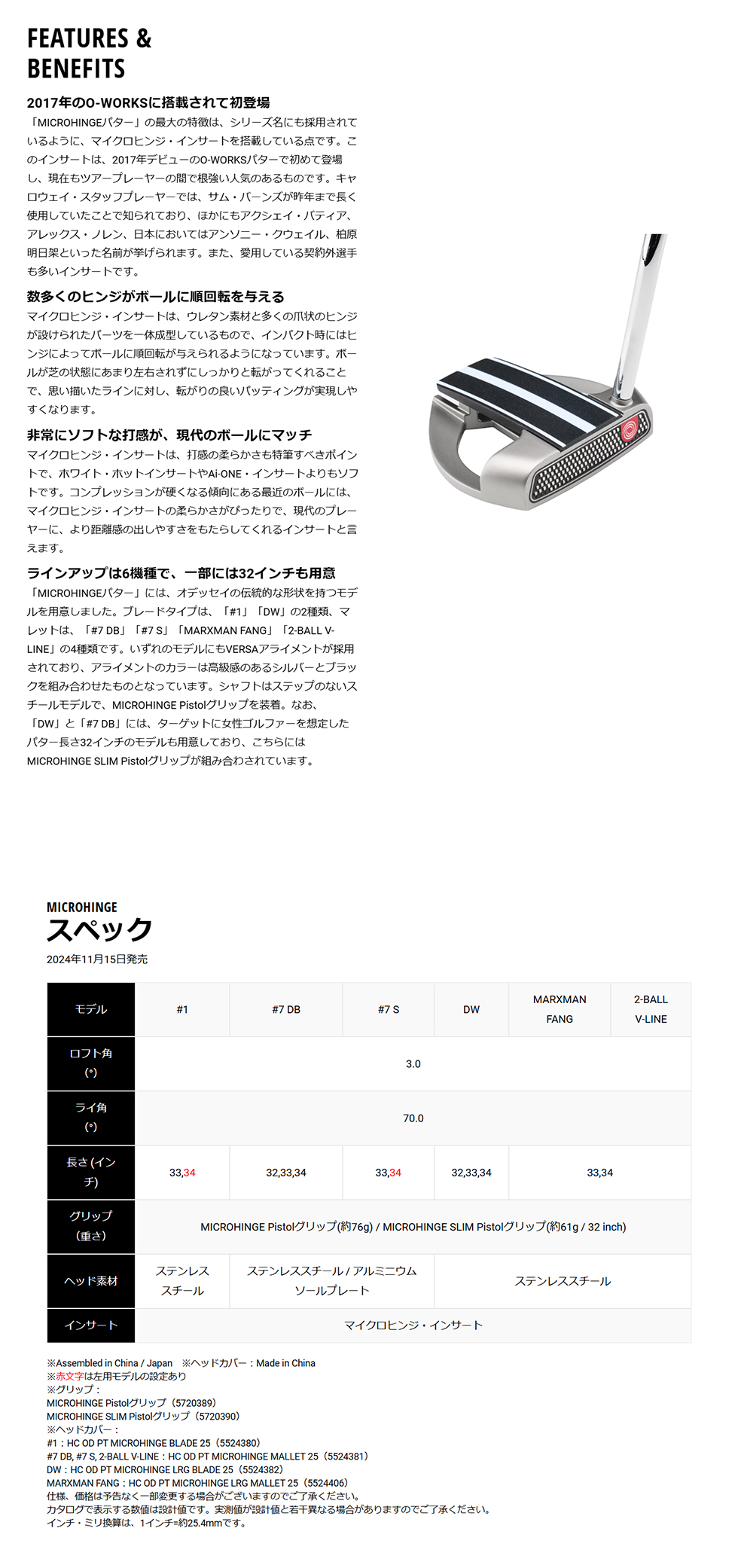 「MICROHINGEパター」には、オデッセイの伝統的な形状を持つモデルを用意しました。ブレードタイプは、「#1」「DW」の2種類、マレットは、「#7 DB」「#7 S」「MARXMAN FANG」「2-BALL V-LINE」の4種類です。いずれのモデルにもVERSAアライメントが採用されており、アライメントのカラーは高級感のあるシルバーとブラックを組み合わせたものとなっています。シャフトはステップのないスチールモデルで、MICROHINGE Pistolグリップを装着。なお、「DW」と「#7 DB」には、ターゲットに女性ゴルファーを想定したパター長さ32インチのモデルも用意しており、こちらにはMICROHINGE SLIM Pistolグリップが組み合わされています。