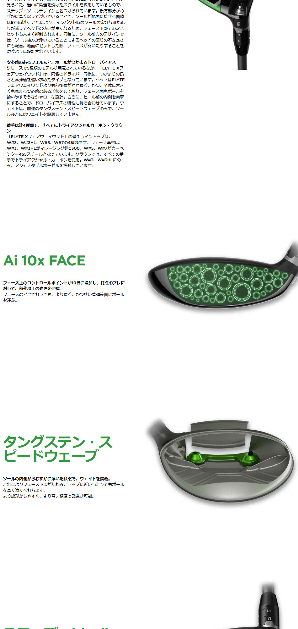 「ELYTE Xフェアウェイウッド」の番手ラインアップは、W#3、W#3HL、W#5、W#7の4種類です。フェース素材は、W#3、W#3HLがマレージング鋼C300、W#5、W#7がカーペンター455スチールとなっています。クラウンでは、すべての番手でトライアクシャル・カーボンを使用。W#3、W#3HLにのみ、アジャスタブルホーゼルを搭載しています。